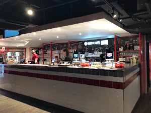 Hot cafe snacks in a football stadium. Contemporary stadium cafe with shiny red decor, for burgers and mixed grills, toasties and pizza.